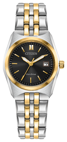 Ladies Citizen Watch EW2299-50E. This Corso model is shown in a two tone case and band and a black dial with a date window. Features include: Eco-Drive technology, mineral crystal, and up to 100 meter water resistance.