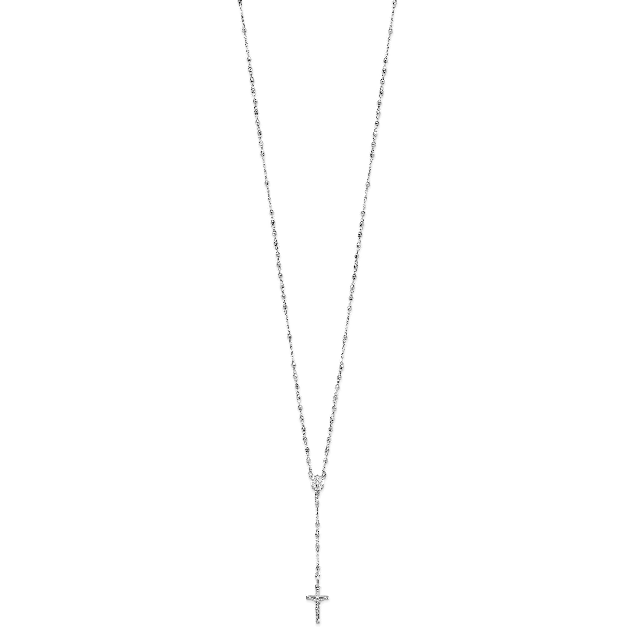 14K White Gold Polished Crucifix and Miraculous Medal with Faceted Beads 18 inch Rosary Necklace